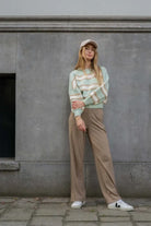 Deze lange broek met visgraat structuur is beige gekleurd. De broek sluit met een ritje welke aan de zijkant van de broek zit. De broek heeft aan de voorkant twee zakken.