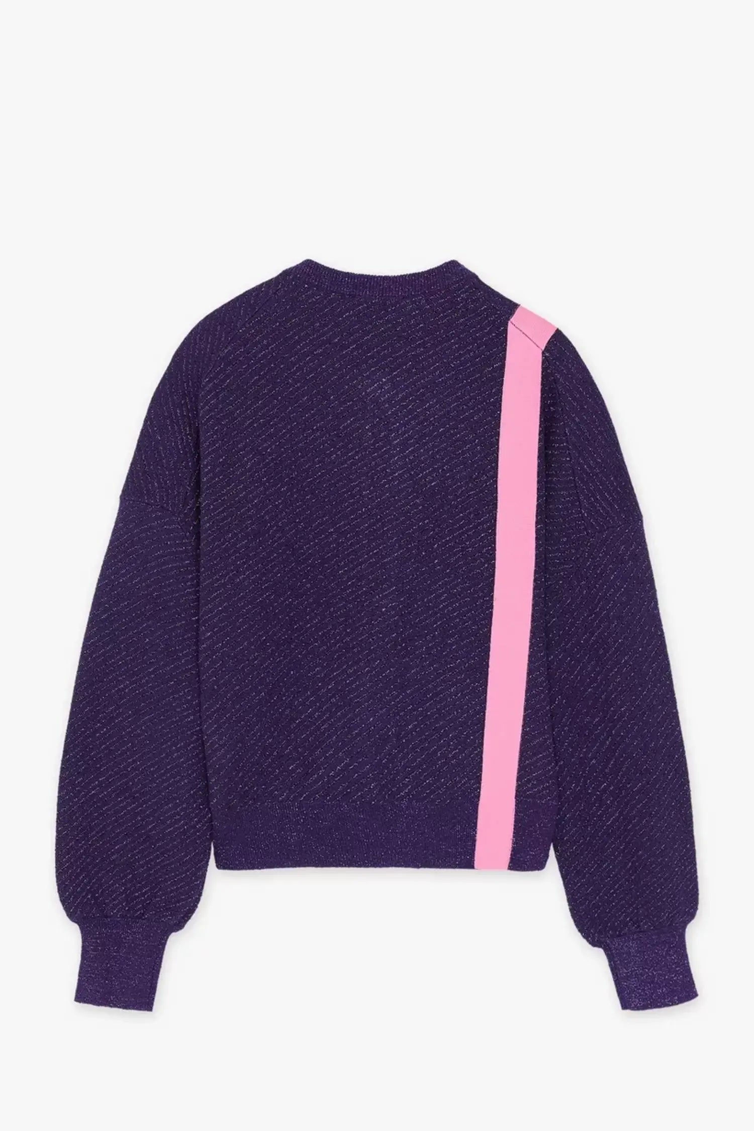 Deze donkerpaarse cardigan heeft een ronde hals, knoopjes, pofmouwen en glitters in combinatie met een diagonaal breipatroon. De opvallende, roze lijnen op de voor- en achterzijde zijn de kers op de taart.