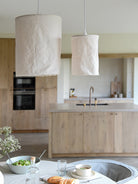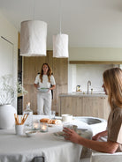De lampenkap is handgemaakt van licht doorschijnend linnen. De lamp is compleet inclusief fitting, snoer en plafondrozet om direct op je favoriete plek in huis op te hangen.